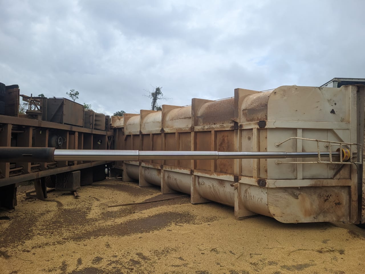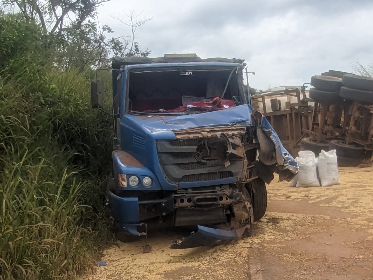 Na sequência, um terceiro veículo — um caminhão Mercedes-Benz Atron 2324, de cor azul — que vinha em sentido oposto, conseguiu evitar uma colisão direta com a caçamba solta, mas acabou atingindo o engate do dolly e ficou parado no local.