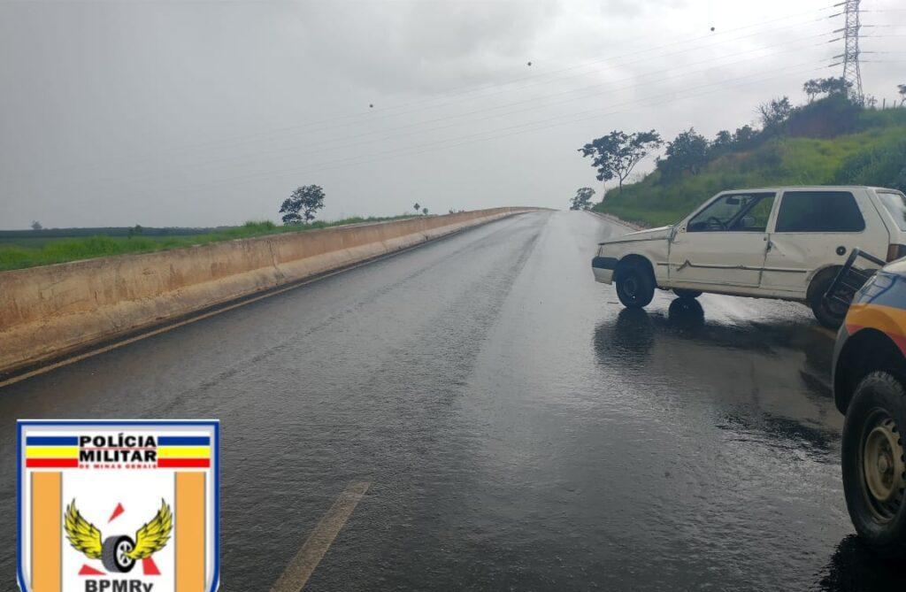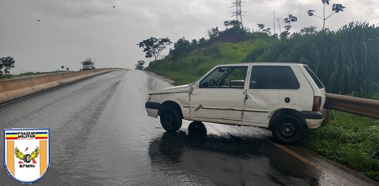 Sendo assim, a equipe policial deslocou ao local indicado onde um rapaz de 26 anos informou que conduzia o veículo Fiat/Uno no sentido Patos de Minas a Lagoa Formosa, quando o veículo aquaplanou, fazendo ele perder o controle direcional do veículo, vindo a tombar na pista de rolamento.
