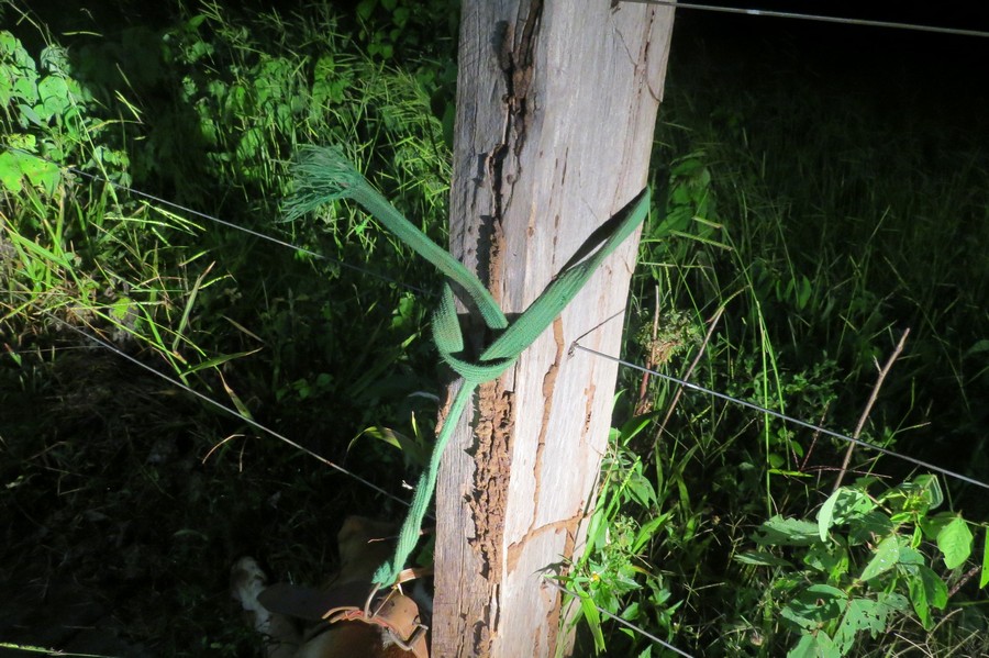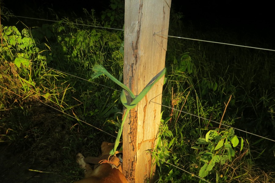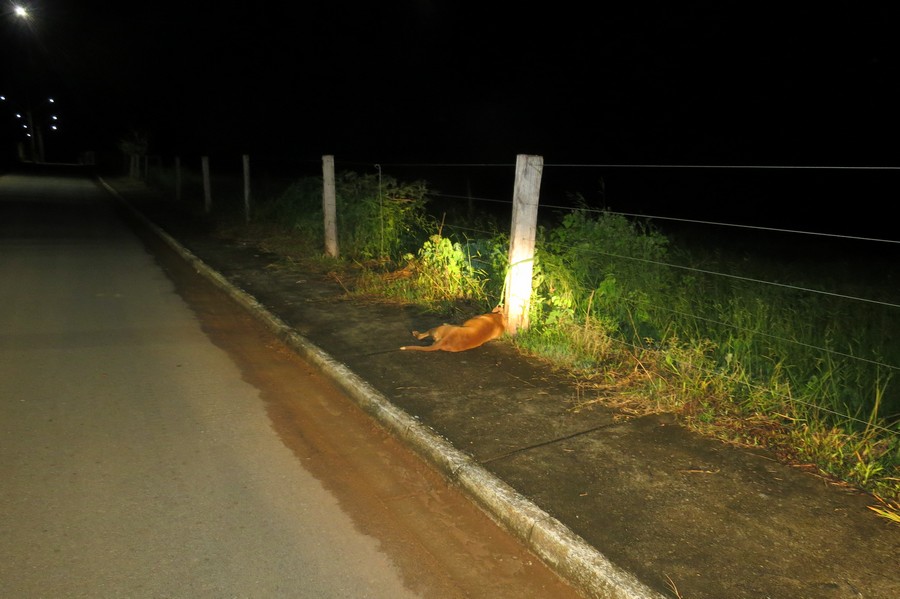 O animal estava amarrado com uma corda na coleira, presa em uma estaca de cerca na Rua Bonfim, próximo ao Cemitério Municipal.