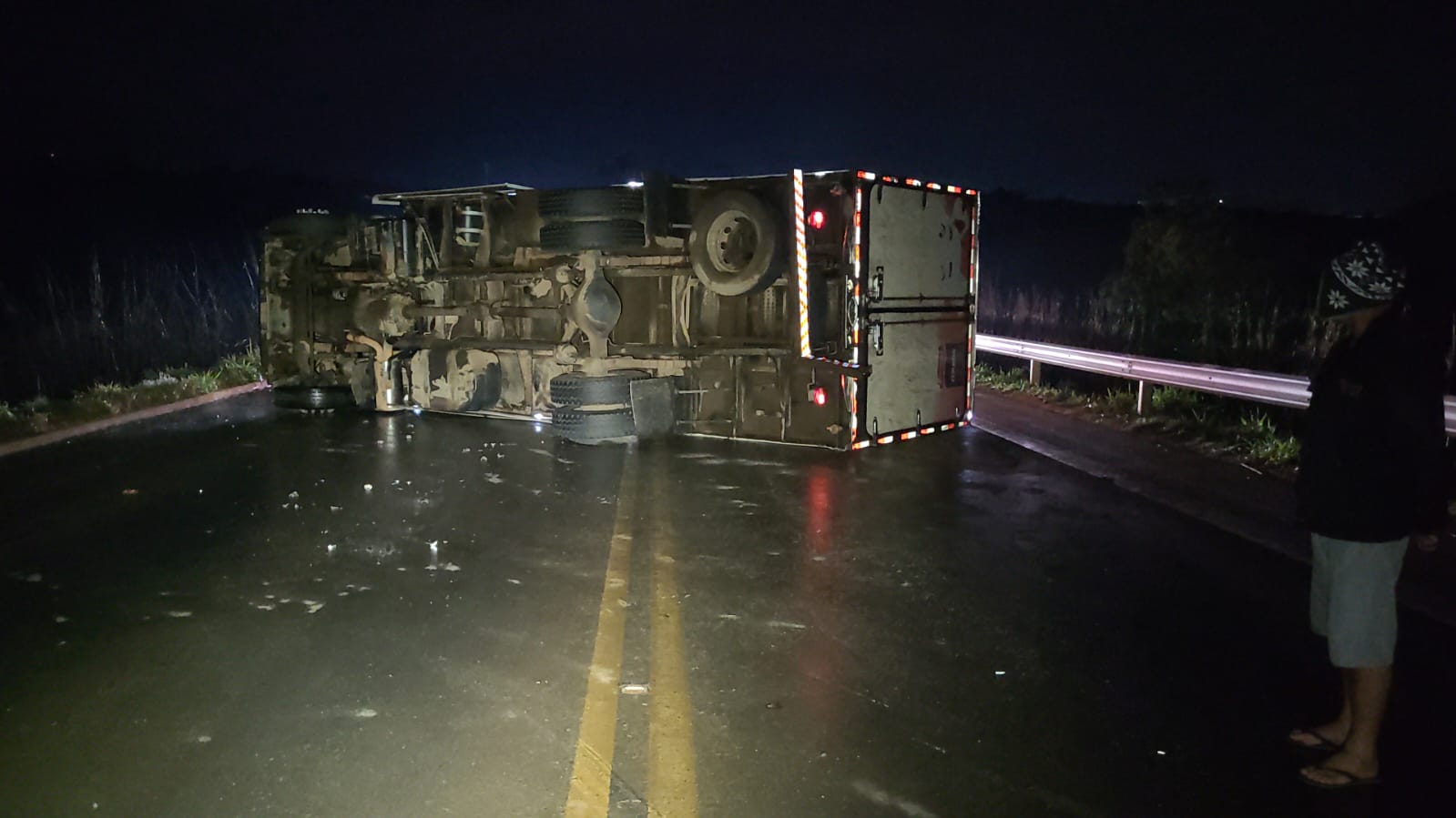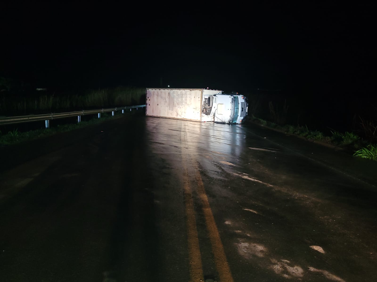 O motorista, de 23 anos, morador de São Sebastião do Oeste (MG), contou que conduzia um VW 17.280, emplacado na mesma cidade, quando o veículo derrapou na pista molhada devido à chuva e acabou tombando.