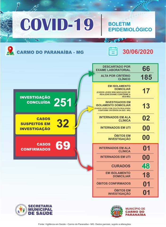 A cidade carmense está com 69 confirmados, sendo que destes um está internado na ala clínica; 18 estão em isolamento domiciliar e 48 pessoas já foram consideradas curadas da doença. O município ainda tem outra morte em investigação.