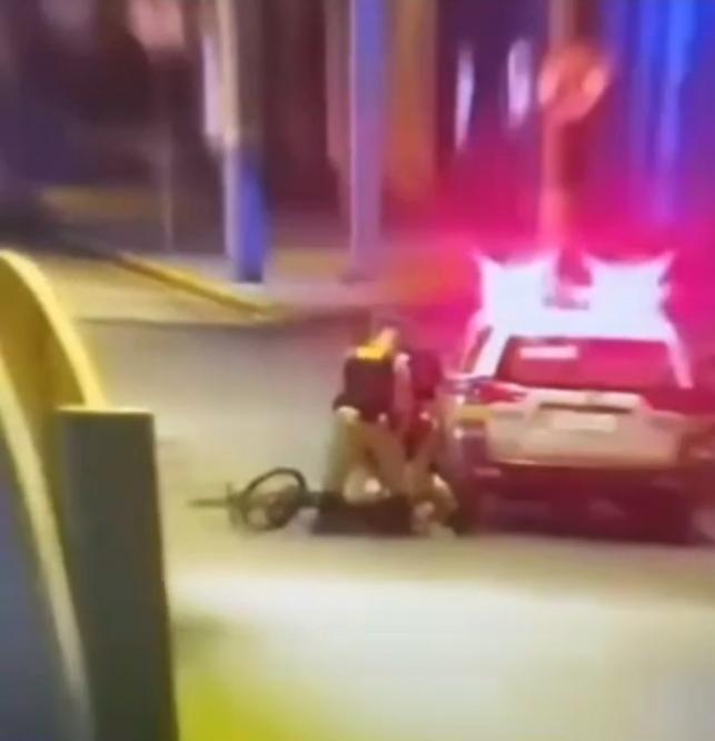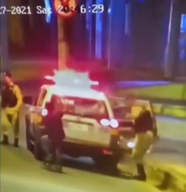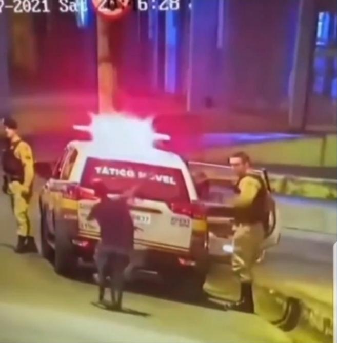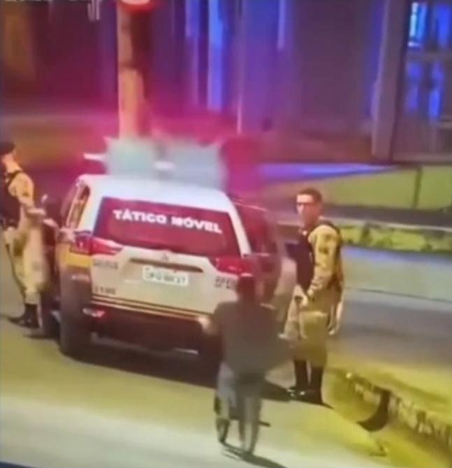 Durante a abordagem, um solicitante acionou a emergência policial via 190 e relatou que um indivíduo em uma bicicleta, magro, de estatura baixa, jovem, vestindo camiseta, bermuda e boné, teria arremessado uma pedra contra o veículo de uma empresa de segurança patrimonial e evadiu sentido Bairro Nações.
