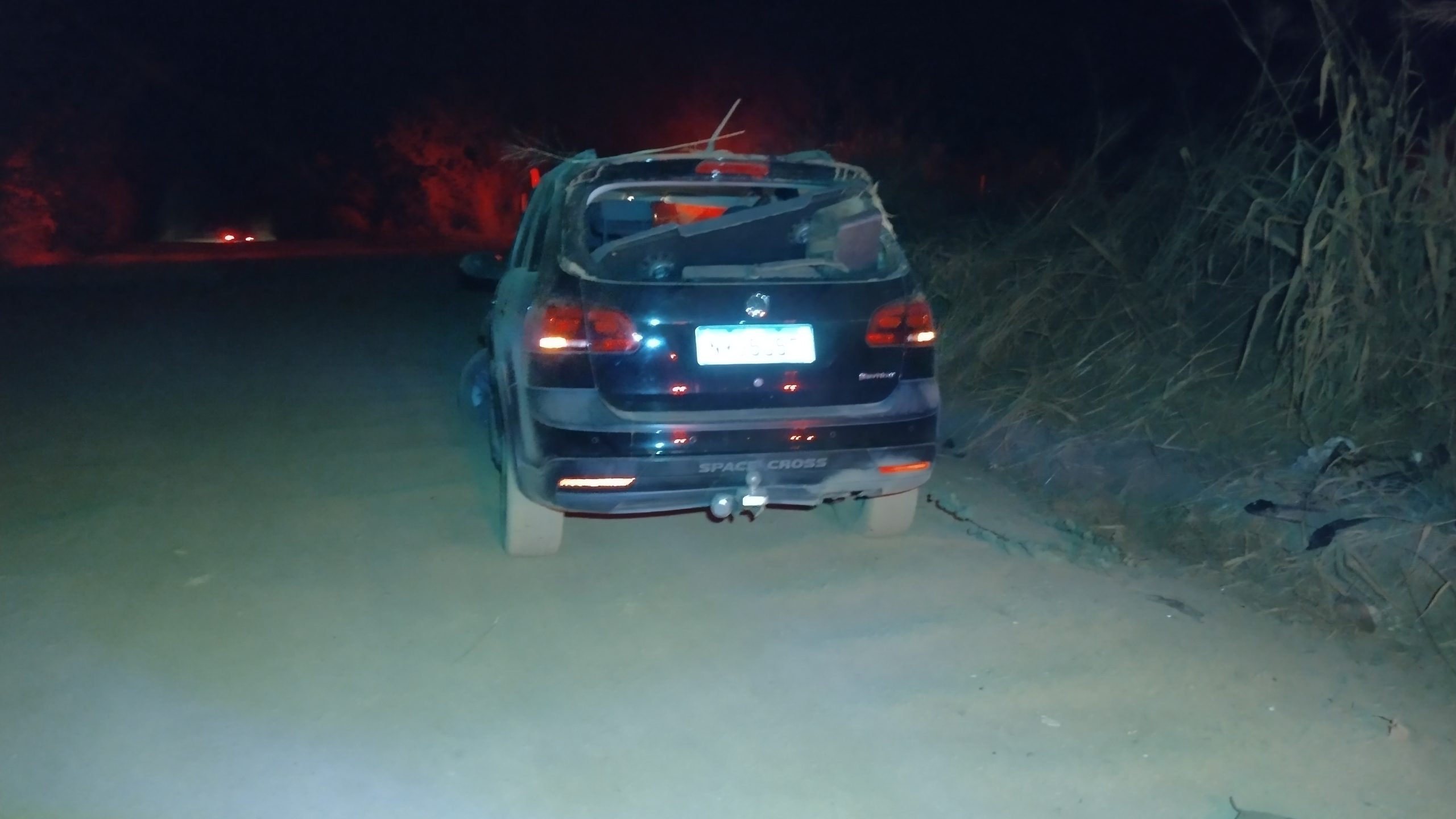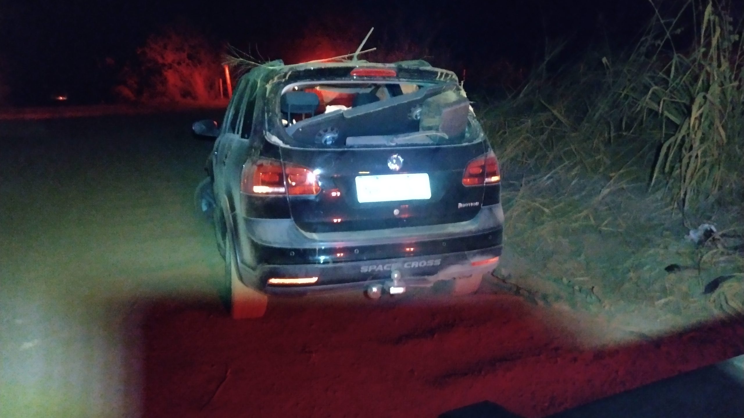 Quando a guarnição chegou ao local, o veículo já havia sido desvirado com a ajuda de terceiros que passaram pela via antes da chegada da PM. O casal apresentava ferimentos leves: a condutora estava confusa e relatava dores pelo corpo, enquanto o passageiro queixava-se de dores no braço esquerdo e nas costas.