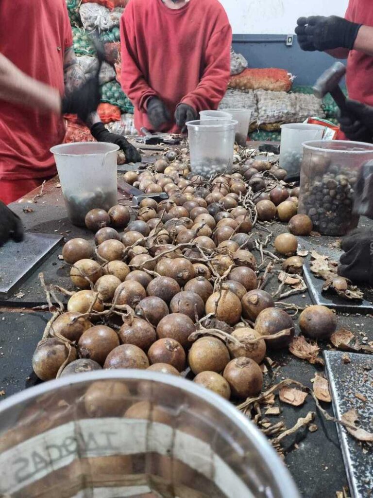De forma artesanal, com o uso de uma marreta, pois ainda não existem máquinas capazes de fazer o que as mãos realizam, os frutos são quebrados e as sementes utilizadas na regeneração de áreas degradas, com o plantio da palmeira de macaúba, uma árvore nativa do Brasil.