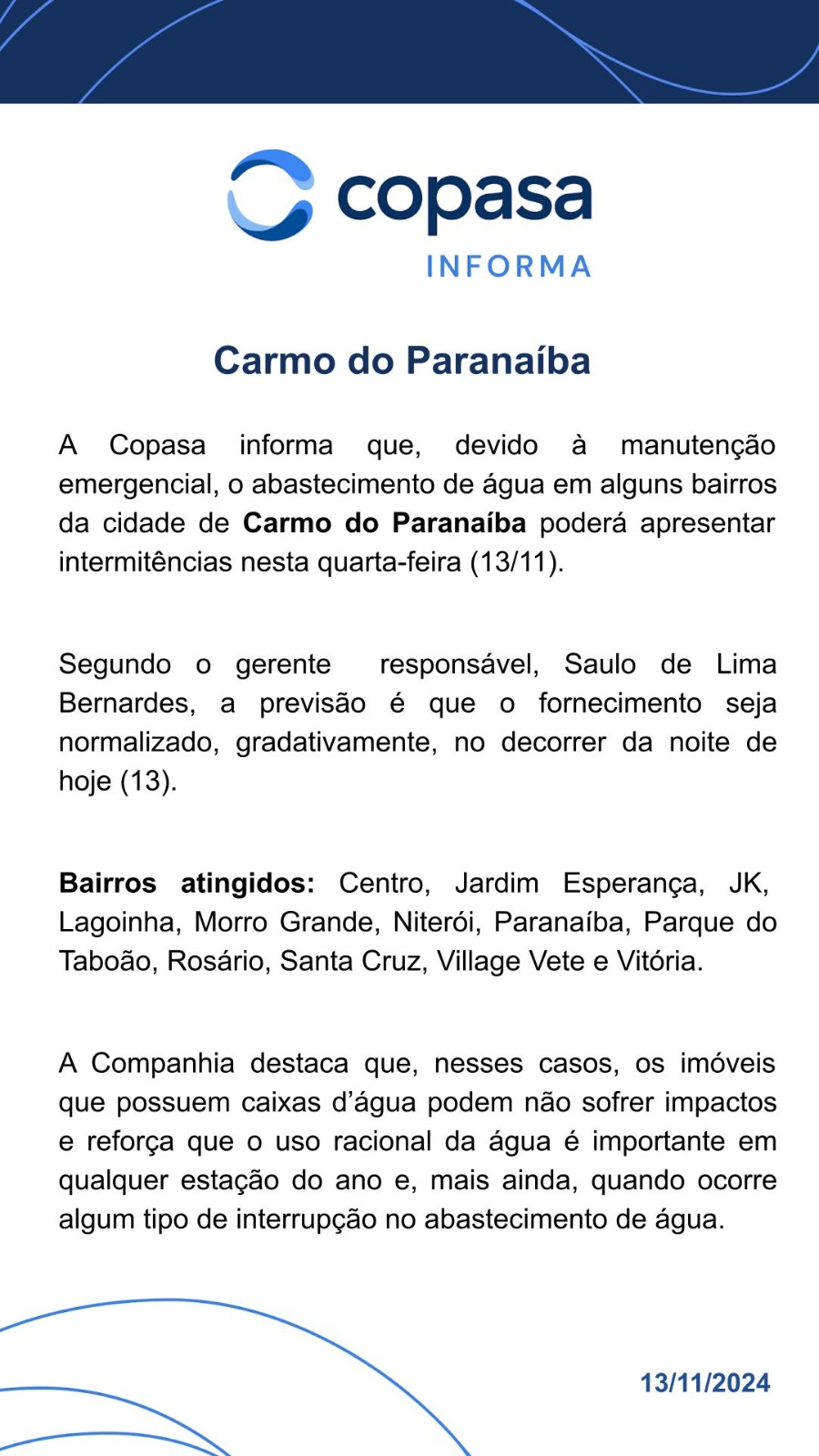 A população de Carmo do Paranaíba vem constantemente sofrendo com interrupções constantes no fornecimento de água, por parte da Copasa. Além disso, a empresa vem realizando diversas obras pela cidade e muitas das vezes, as obras não são finalizadas em tempo hábil, gerando transtornos tanto no trânsito, bem como, para os moradores.