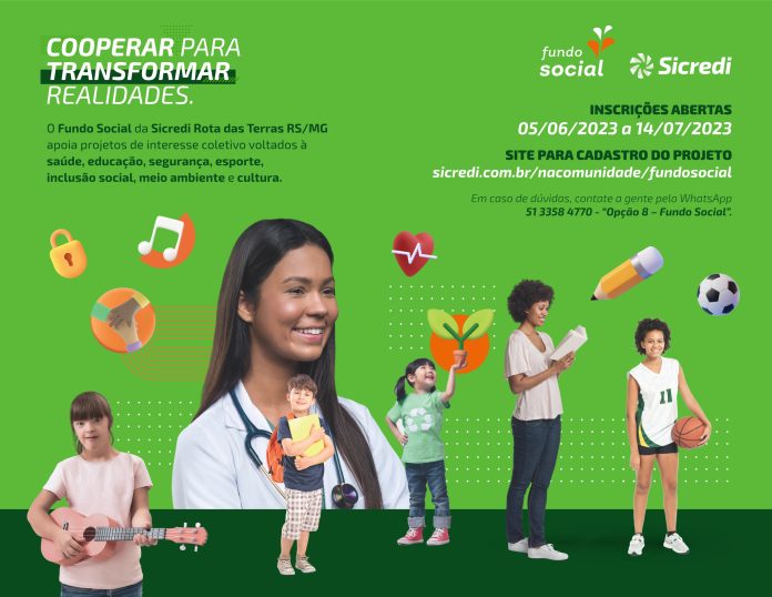 A Sicredi Rota das Terras RS/MG vem apoiando projetos sociais nos municípios da sua área de atuação e fazendo a diferença na vida de muitas pessoas e famílias desde a sua fundação. Reforçando o propósito de construir uma sociedade mais próspera, a instituição financeira cooperativa está com as inscrições abertas para o Fundo Social 2023.