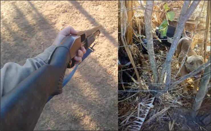 Uma guarnição da PM compareceu ao referido endereço, os militares constataram que não havia água e nem comida para os cachorros. Na casa, não havia ninguém e, ao adentrar no lote, foi verificado que a parta da casa estava aberta, tendo os policiais visto algo parecido com o cano de uma arma de fogo longa.