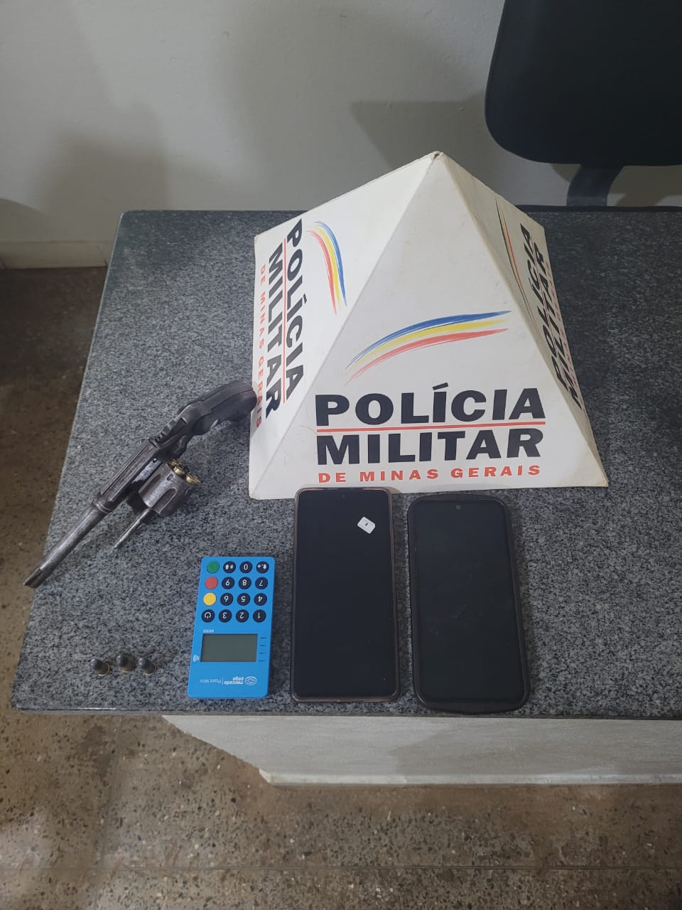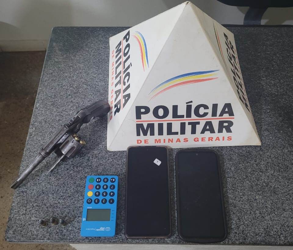 Além da arma de fogo e das munições, também foram apreendidos dois celulares e uma máquina de cartão de crédito. O suspeito foi preso em flagrante, e o veículo foi removido ao pátio.
