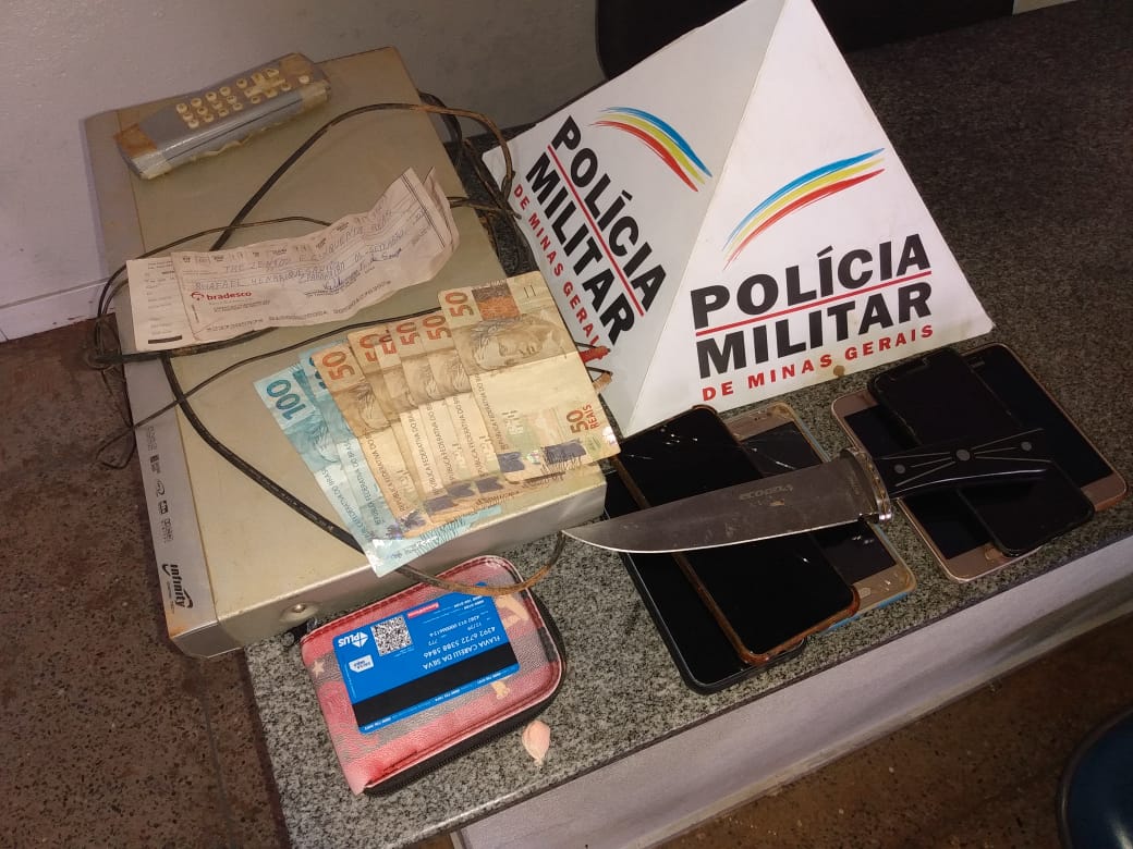 Ambos foram presos e o menor apreendido. Foram recuperados uma carteira de bolso, um cartão bancário, seis aparelhos celulares, R$509,25 em espécie, duas folhas de cheque em branco, uma faca e um aparelho de DVD.
