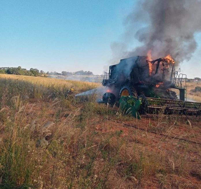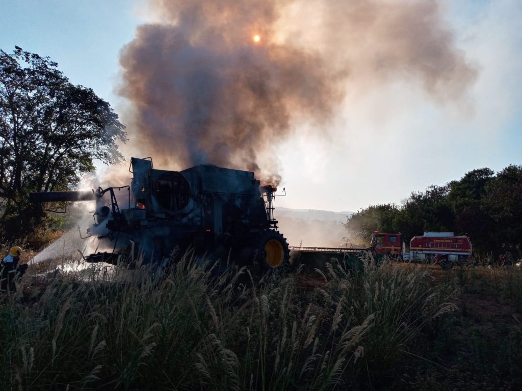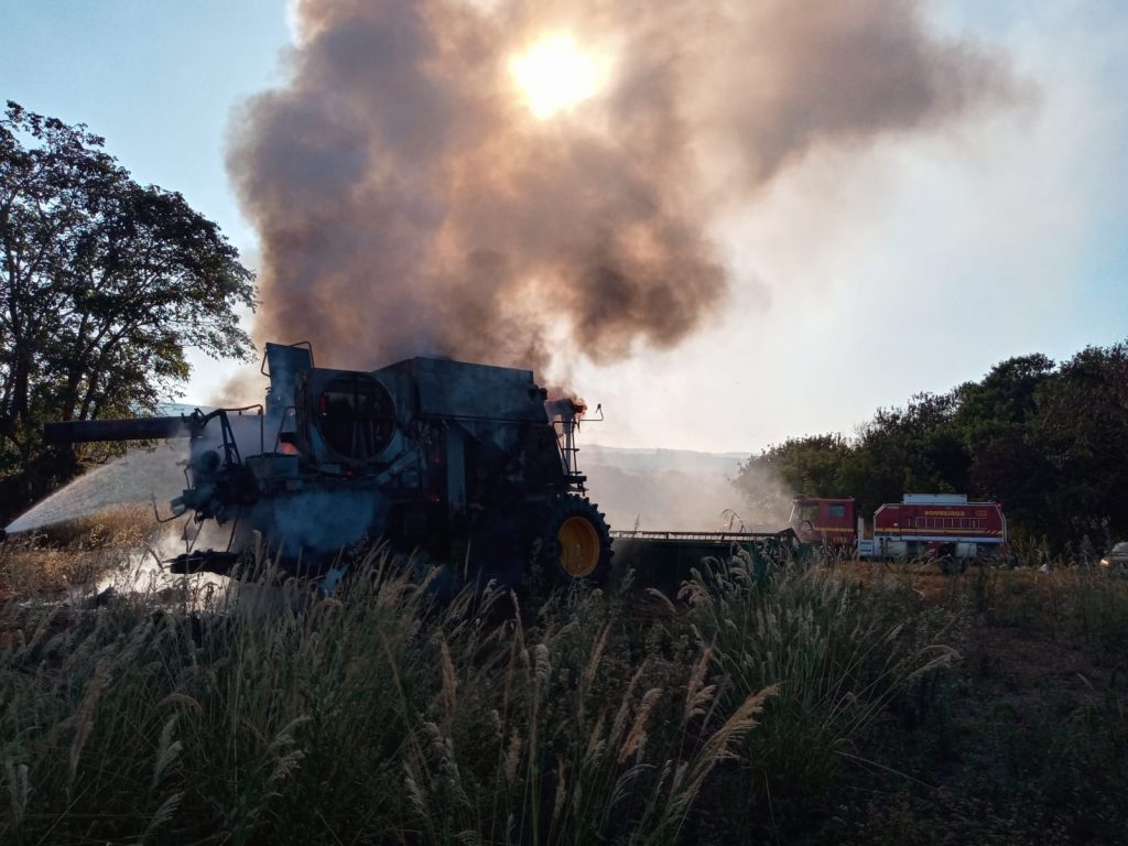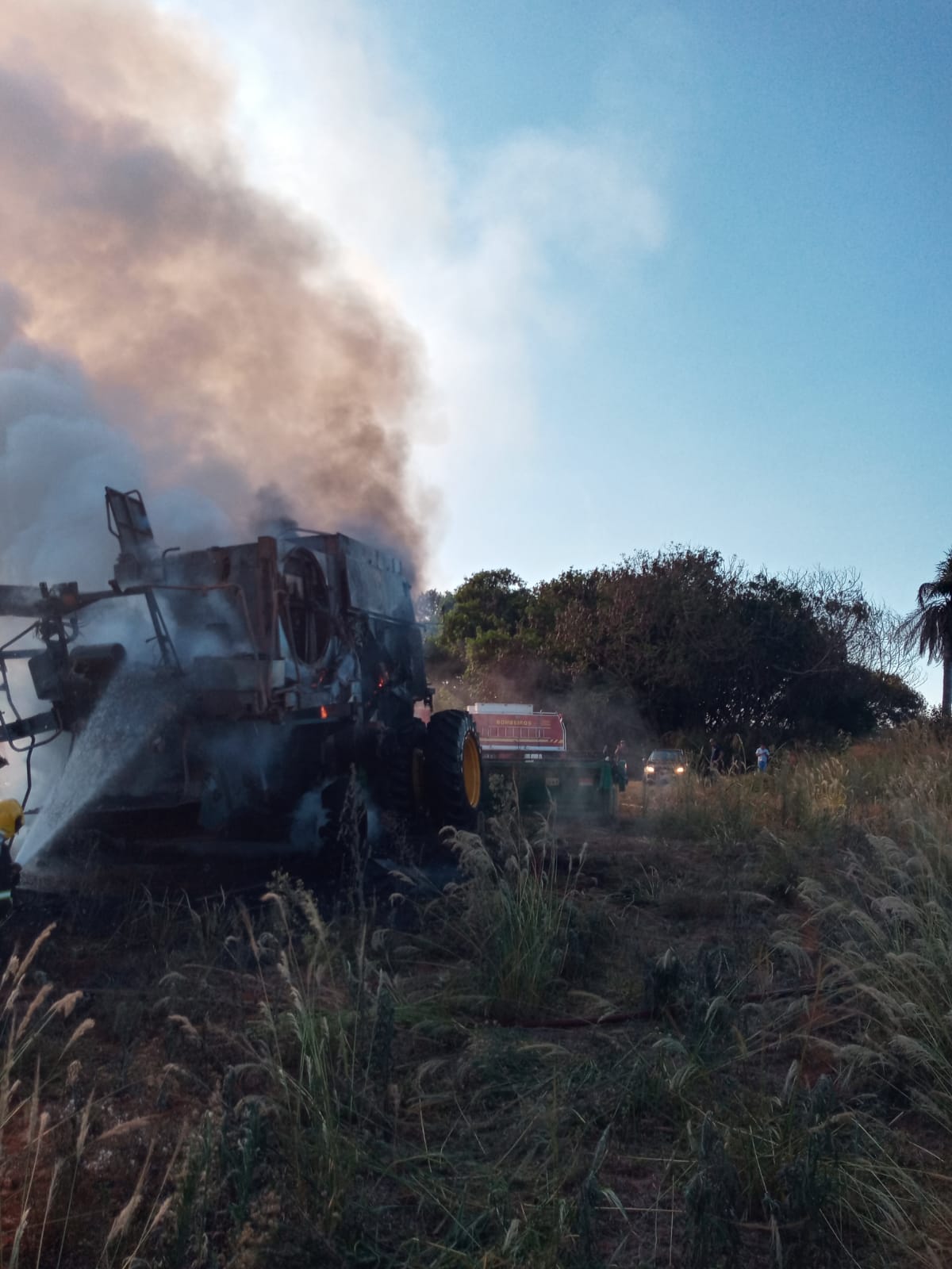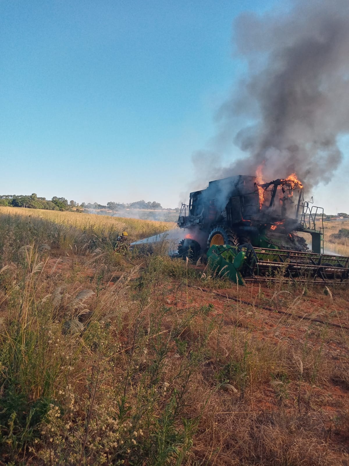 Corpo de Bombeiros foi acionado na tarde desta quarta-feira (20) para um atendimento de incêndio em uma colheitadeira. A máquina estava realizando uma colheita de sorgo em propriedade rural as margens da rodovia municipal Natalino Caixeta, a chamada “Estrada da Serrinha”, na localidade de Baixadinha, quando começou a pegar fogo.