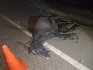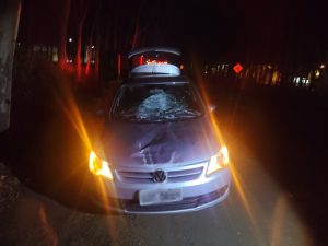 Outro carro que trafegava pelo local também atingiu o animal, sofrendo avarias no para-choque. O motorista saiu ileso.
