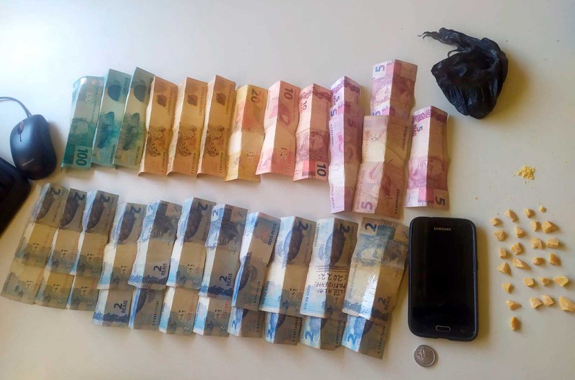 Os policiais procederam a abordagem e busca pessoal no indivíduo de 26 anos, sendo localizados na cueca um invólucro plástico contendo 25 pedras de crack em tamanho comercial, a quantia de R$ 549,50 em notas diversas e um aparelho celular.