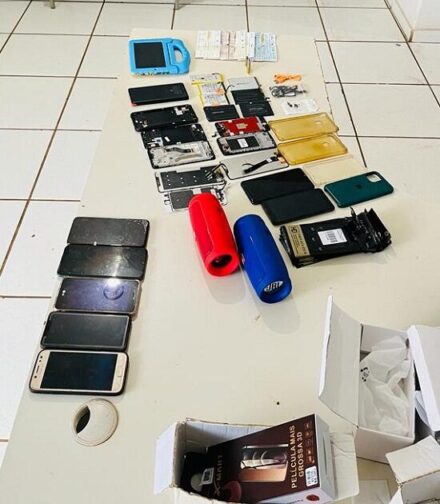 Em seguida, próximo ao local, os policiais encontraram uma sacola com cinco aparelhos celulares, que foram reconhecidos pelo proprietário da loja como sendo parte dos produtos furtados. Logo após, um dos indivíduos, que reside em Patos de Minas, confessou que estava na cidade para praticar o crime. Os capacetes que eles usaram foram encontrados escondidos num brejo.