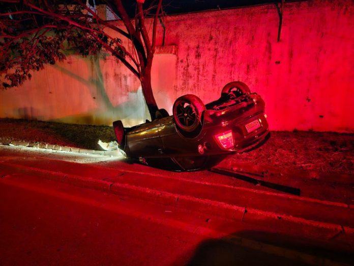 O veículo GM Astra descia pela avenida J.K em direção ao Trevo da Pipoca. Na primeira curva, antes de chegar ao posto de combustíveis, aconteceu o acidente. O carro capotou e parou com as quatro rodas para o alto.
