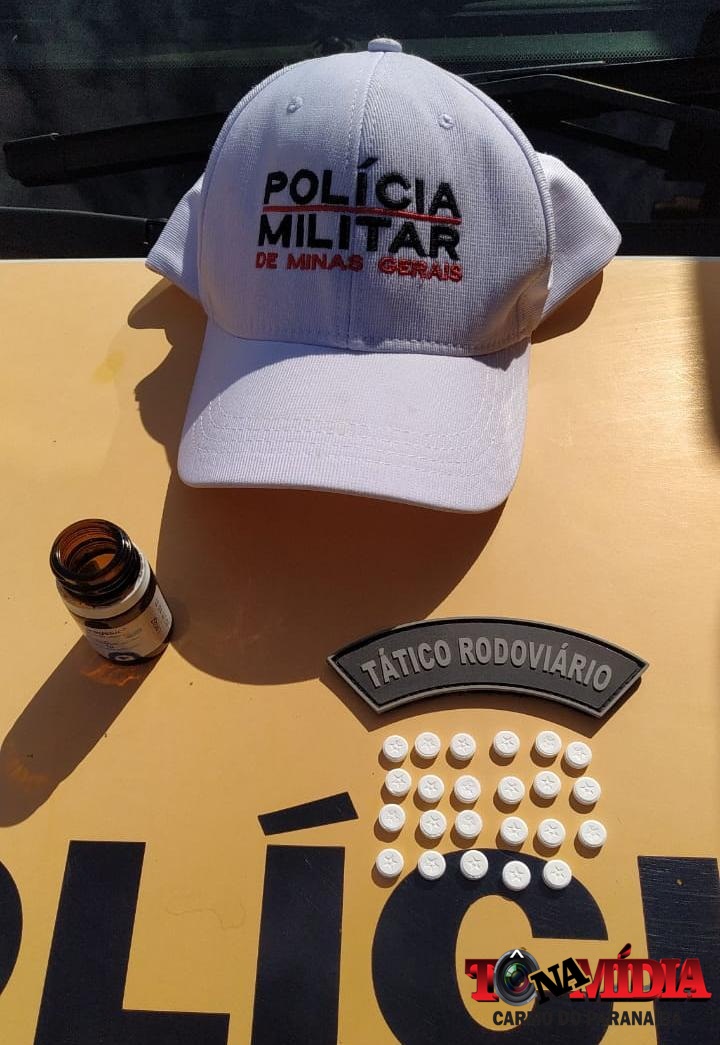 Quando os policiais conversaram com o condutor, foi constatado que sua capacidade psicomotora estava totalmente alterada e, durante busca no interior da cabine, foi localizado em um frasco de vidro contendo 23 comprimidos de “rebite”.