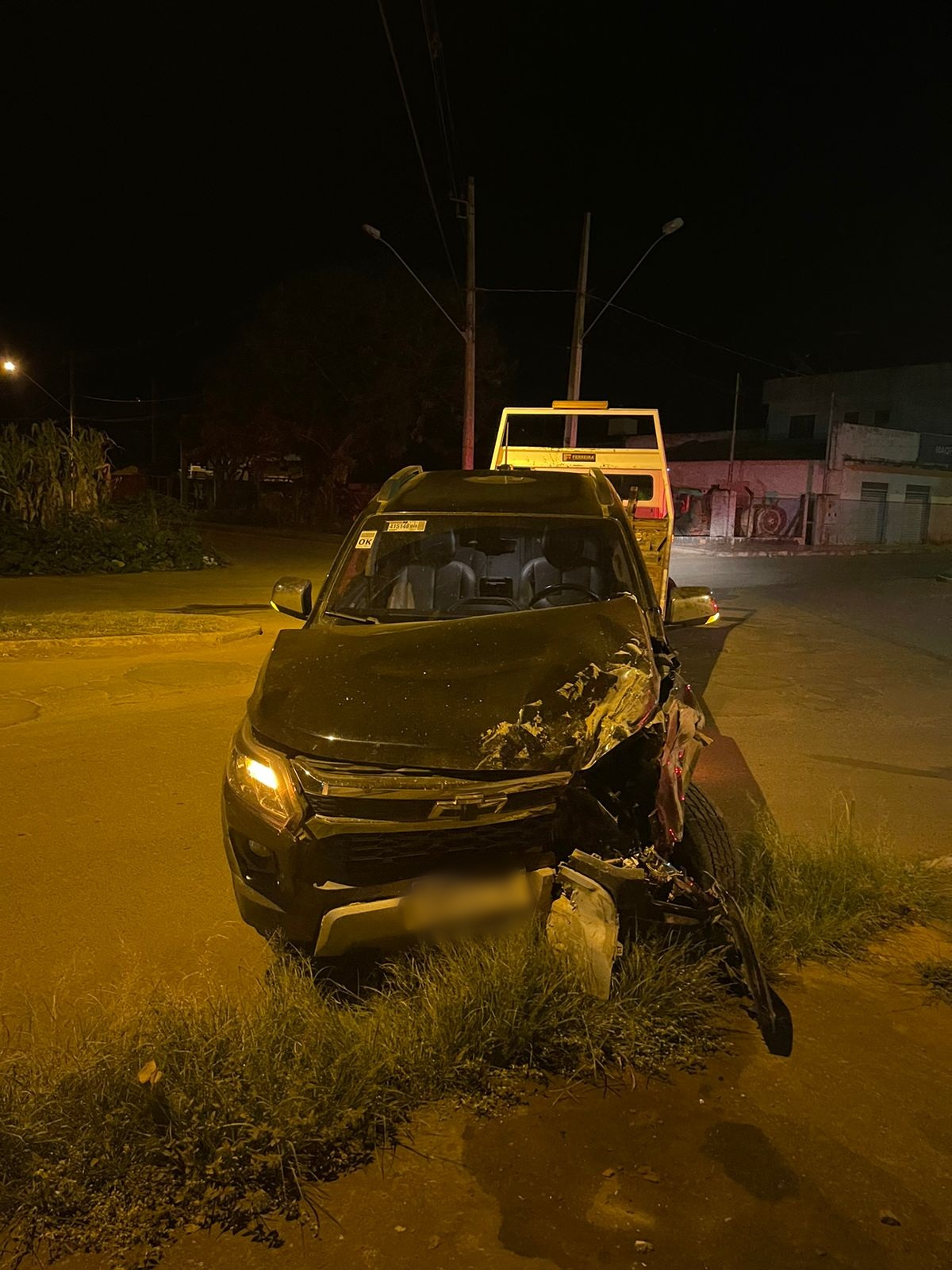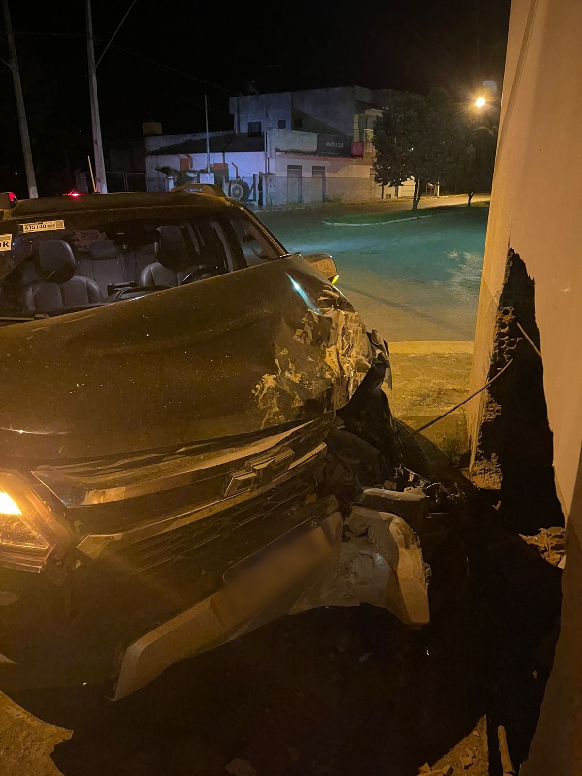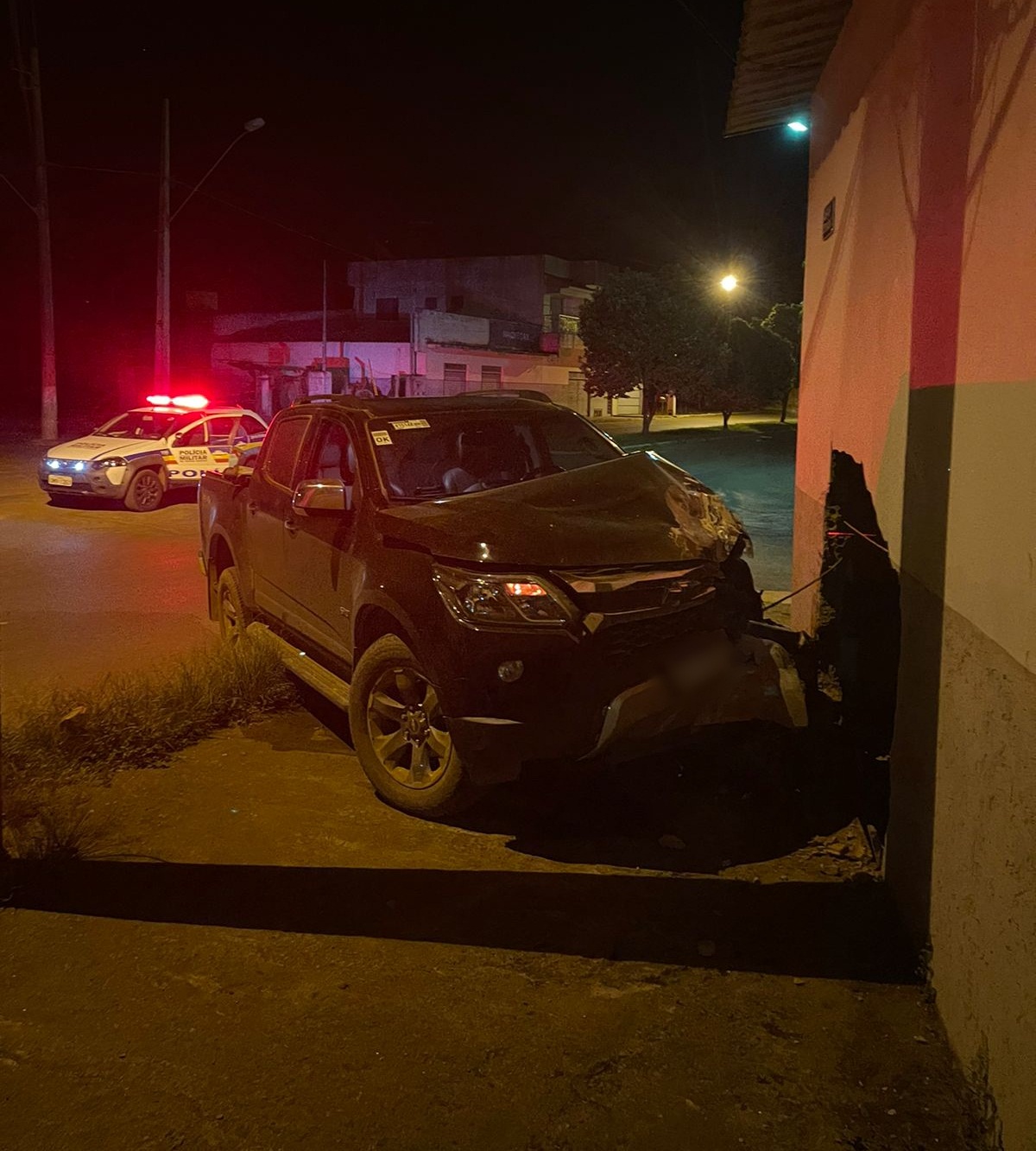 Os policiais chegaram e encontraram a caminhonete GM/S-10 preta abandonada no local, sem condições de transitar. Ela havia batido contra o muro lateral do salão da Igreja Santos Reis, que foi danificado.