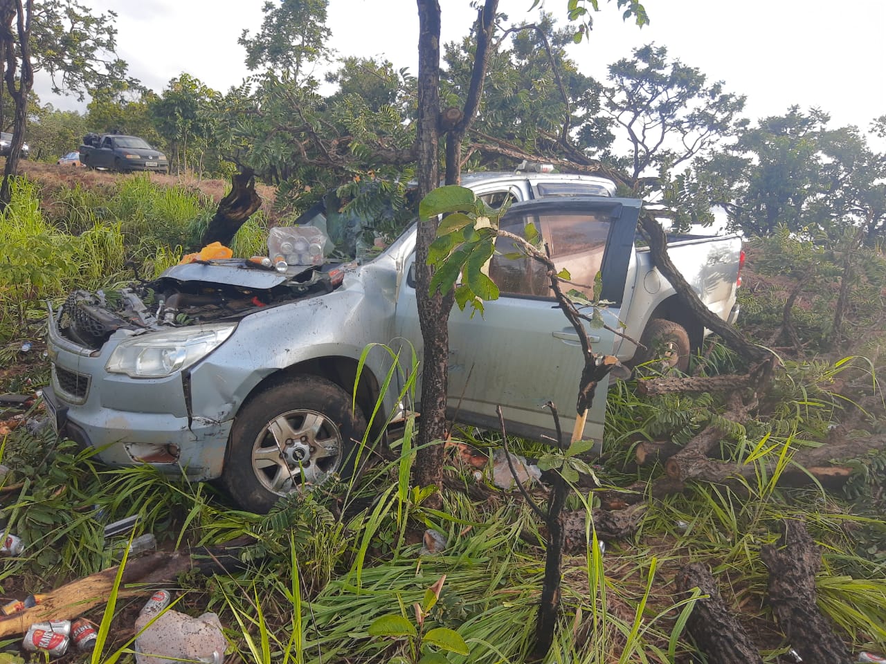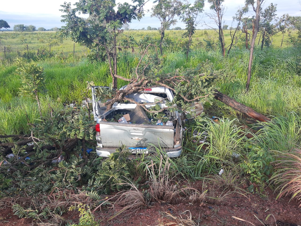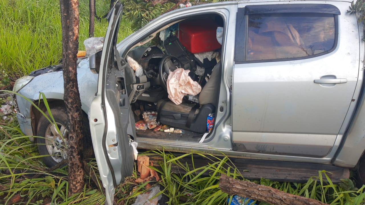 Quando chegou ao local, a PMR deparou com a camionete Chevrolet/S10 LT DD4, fora da pista de rolamento, no sentido crescente a via.