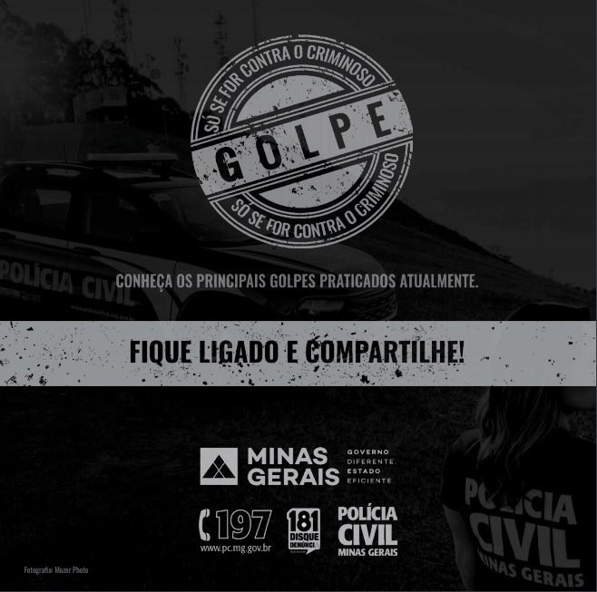 A partir de um estudo com base em estatísticas e no trabalho de inteligência, a PCMG elaborou e disponibiliza o material orientativo, com linguagem clara e objetiva para acesso de todas as pessoas. Ao todo, a cartilha apresenta 16 tipos de golpes, divididos em três modalidades: Golpes Presenciais, Golpes pela Internet e Crimes Praticados por Telefone. Acesse aqui.