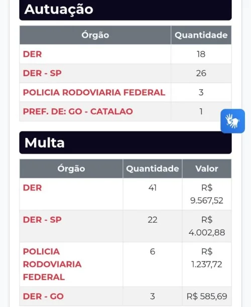 Consultas aos sistemas revelaram que o caminhão acumulava 72 multas de trânsito, 48 autuações e débitos de IPVA, motivo pelo qual não possuía licenciamento válido.