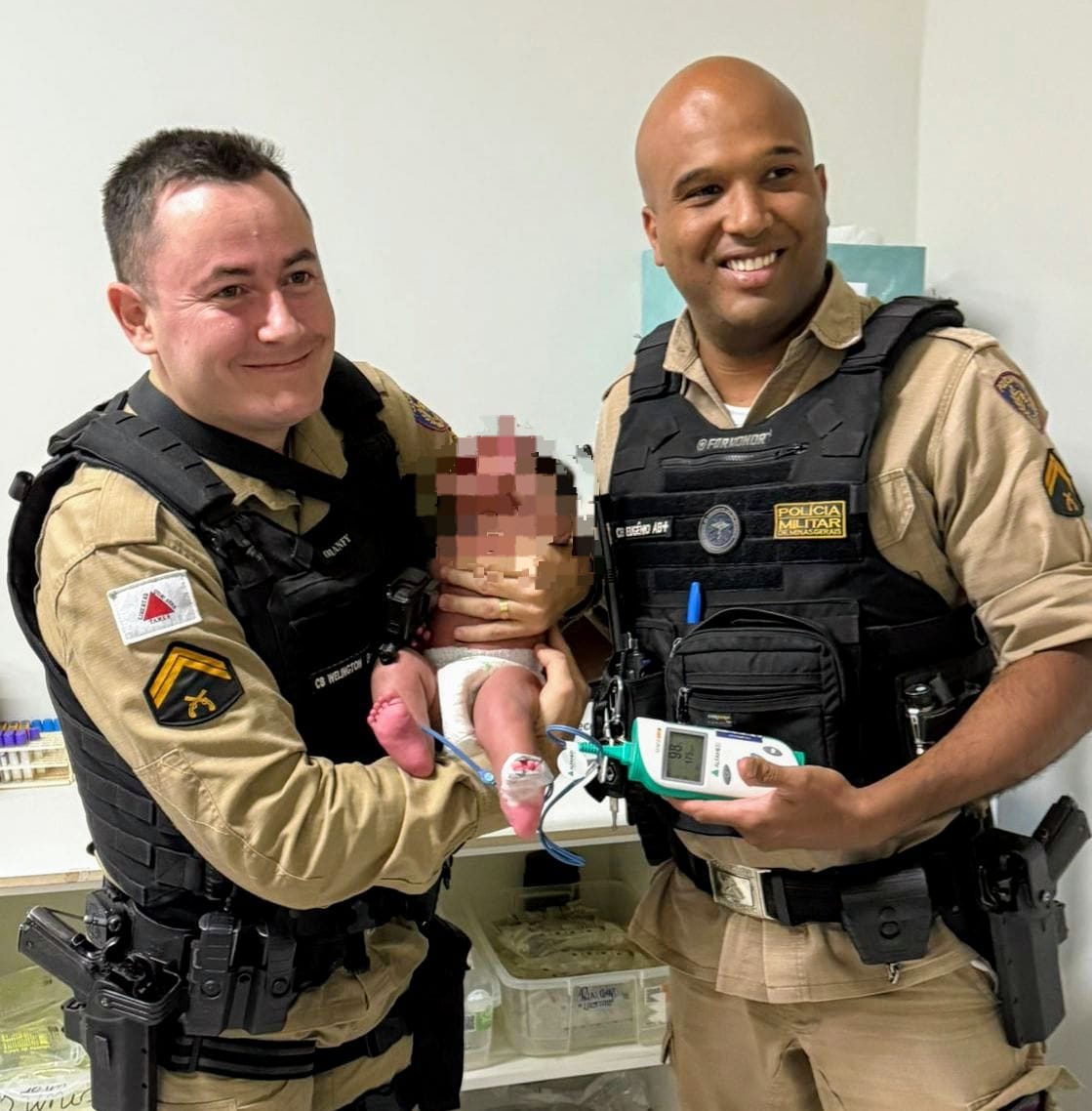 A pequena Maria Alice, de apenas 1 mês e 7 dias, se engasgou após a amamentação e parou de respirar. A mãe, desesperada, procurou ajuda no quartel da Polícia Militar. Os cabos Welington e Eugênio imediatamente prestaram socorro.