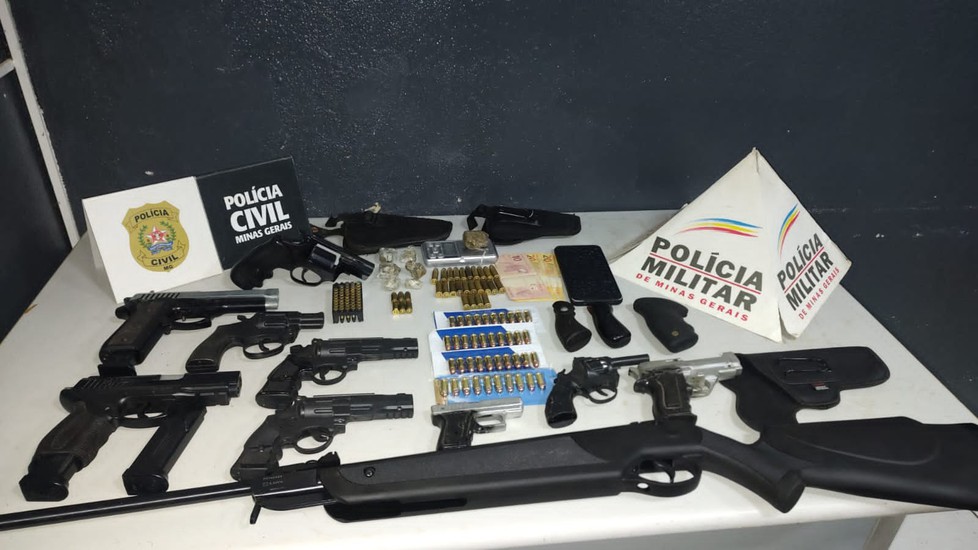 Durante as buscas, na casa de um dos alvos, foram localizadas armas de fogo, 40 cartuchos de munição calibre 380, 46 munições de calibres 22, cartuchos 9mm, coldres velados, além de diversas réplicas de armamento, uma balança de precisão e drogas.