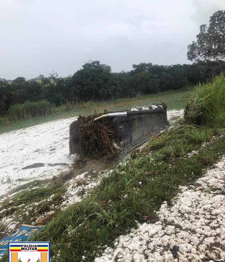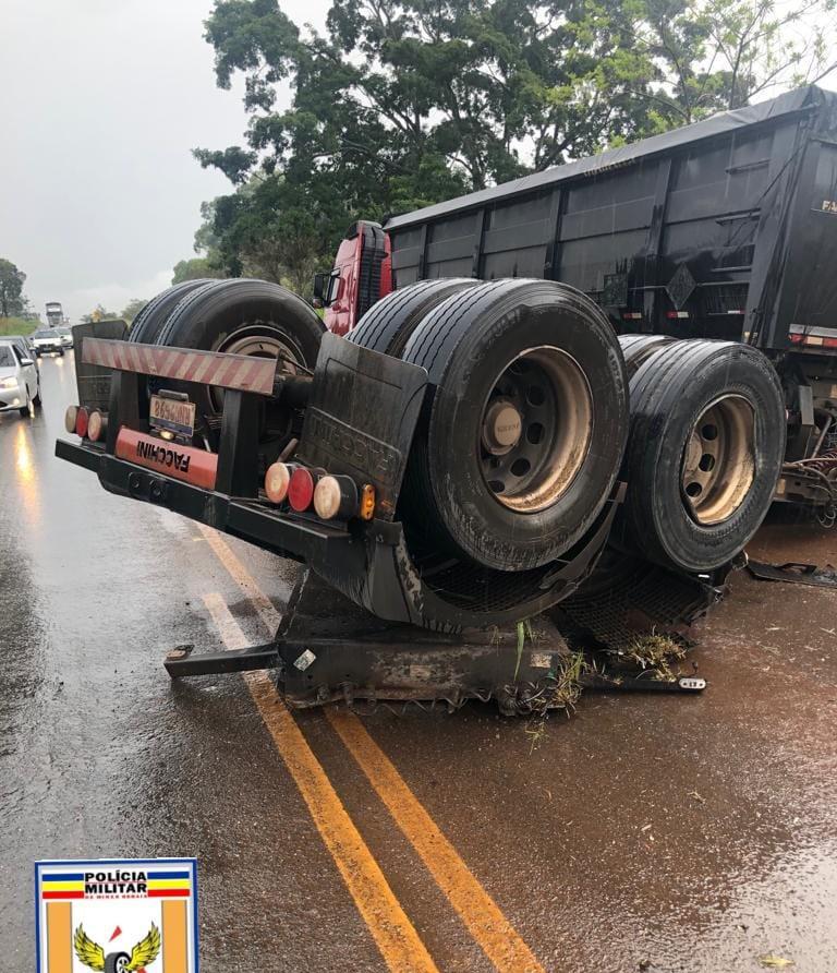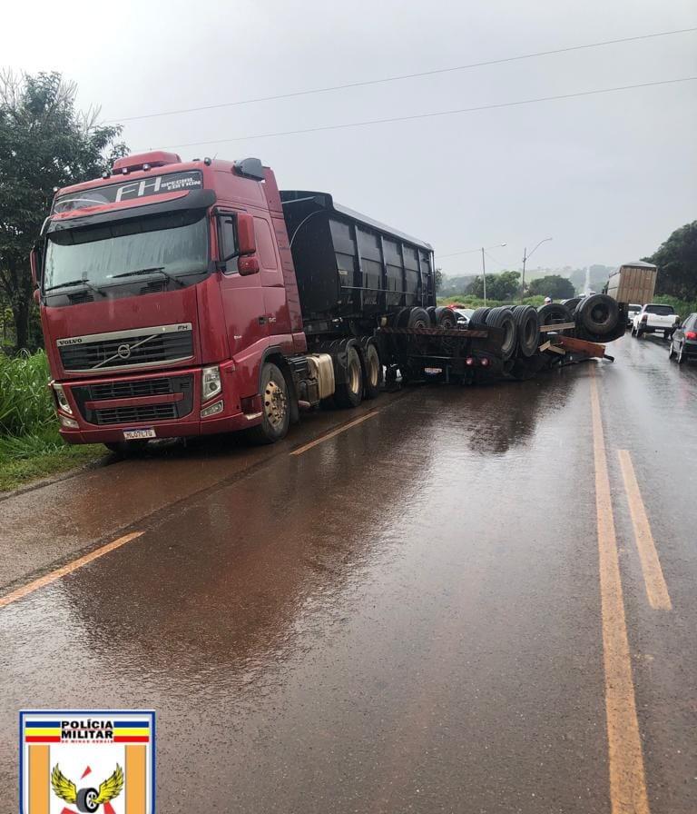 O acidente aconteceu nesse sábado (11) no km 187 da BR 352, em Lagoa Formosa. O rodotrem de 9 eixos seguia pela rodovia quando uma caçamba se soltou. Com isso, o semirreboque acabou capotando na pista. O motorista que realizou o teste de alcoolemia e não constatou ingestão de bebida alcoólica não se feriu. A carga de cal ficou espalhada pelo local.