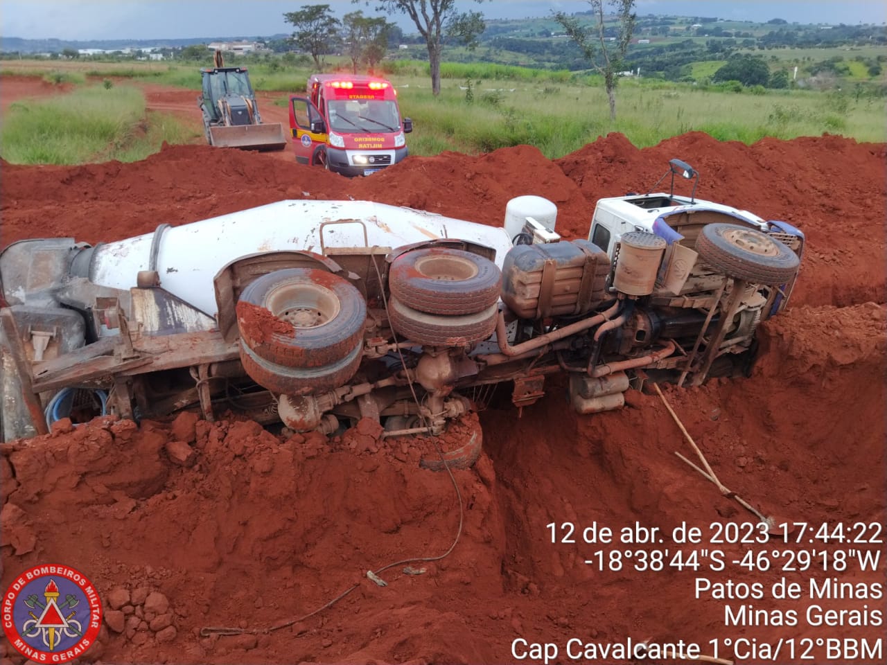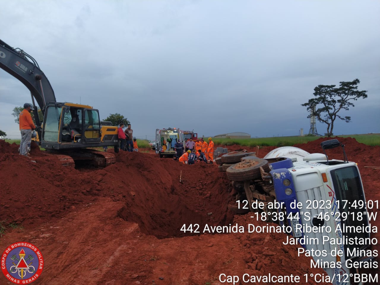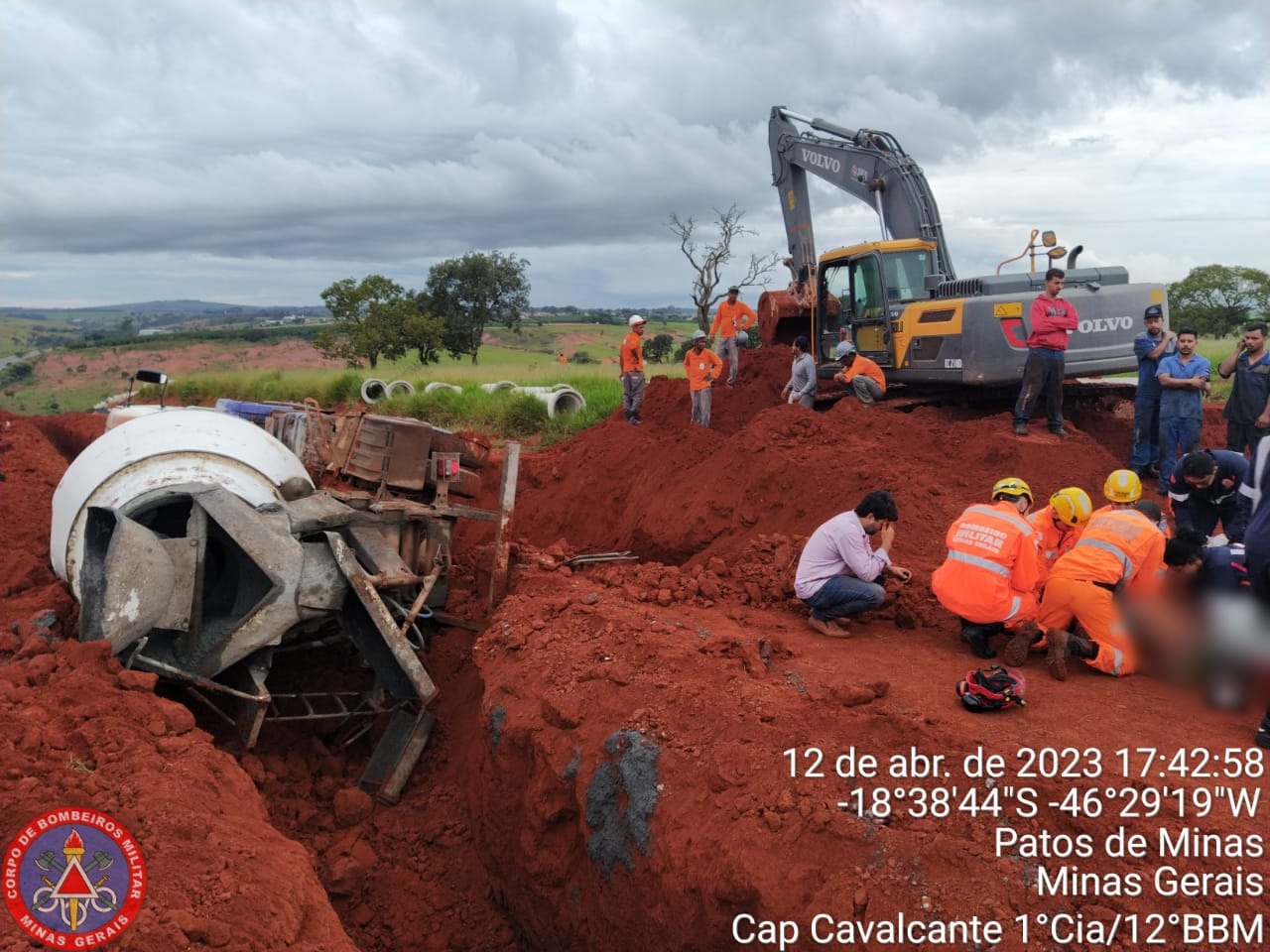 O trabalhador estava dentro da valeta e o caminhão betoneira trafegava no plano para fornecer o concreto. O terreno cedeu, tombou o caminhão e soterrou o funcionário.