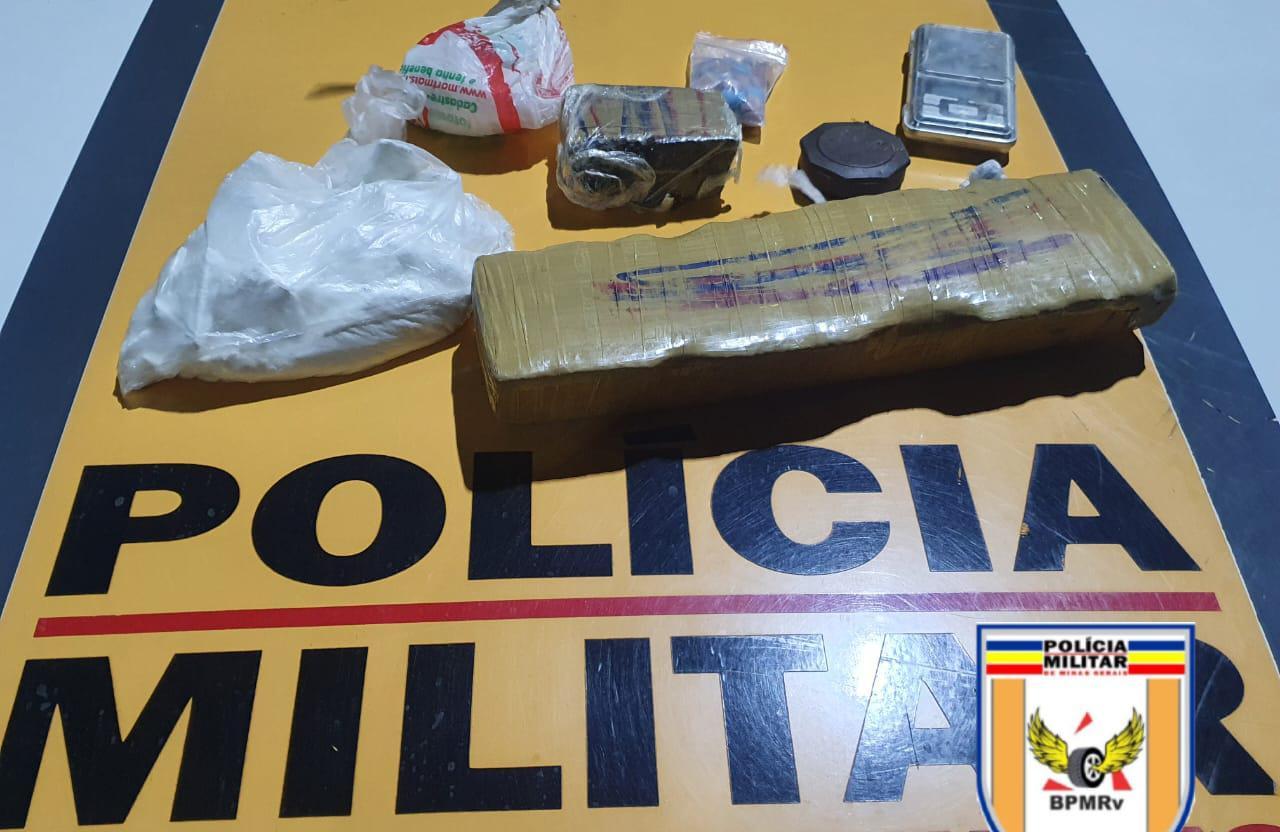 Foi realizada busca no interior do automóvel, sendo localizado sobre o banco do passageiro dianteiro 1 dichavador. Embaixo do mesmo banco, foram localizados dentro de uma mochila uma barra grande de maconha, uma sacola contendo cerca de 350g de cocaína, 58 comprimidos de ecstasy e uma balança digital de precisão.
