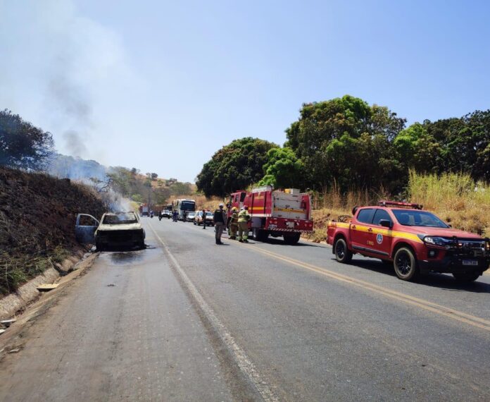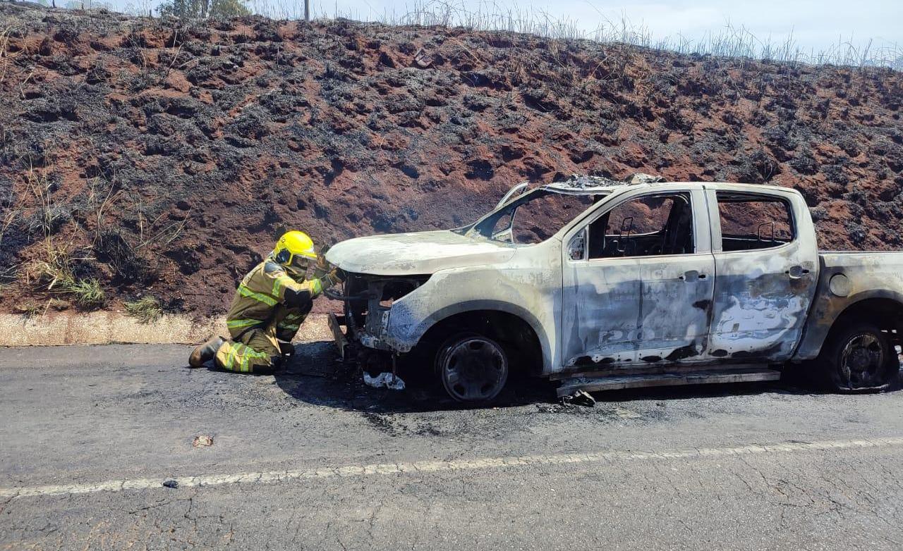Uma guarnição do caminhão de combate a incêndio juntamente com uma guarnição da camioneta de combate a incêndio florestal do Corpo de Bombeiros de Patos de Minas deslocaram-se para o local para combater os incêndios no veículo e na vegetação.
